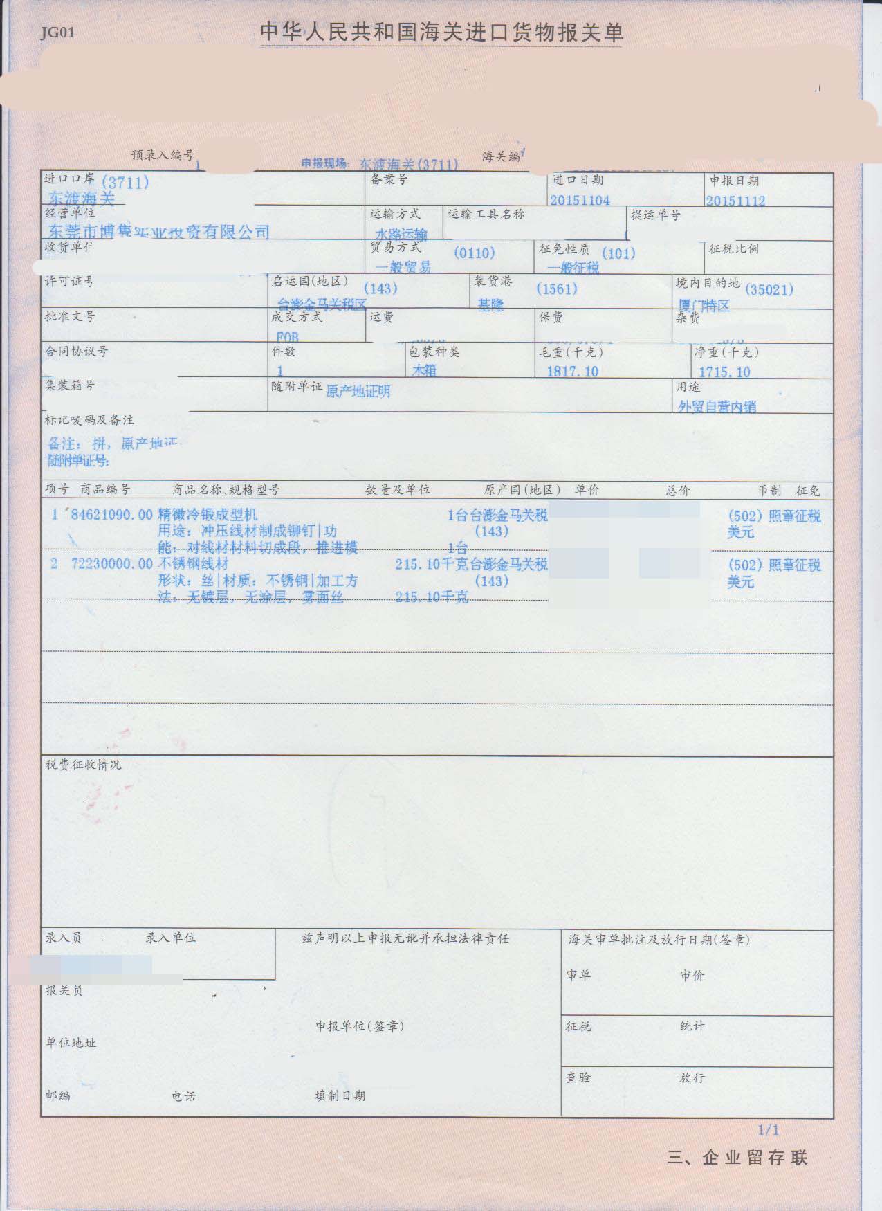 三、精微冷鍛成型機進口報關(guān)案例展示