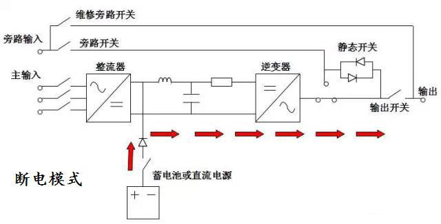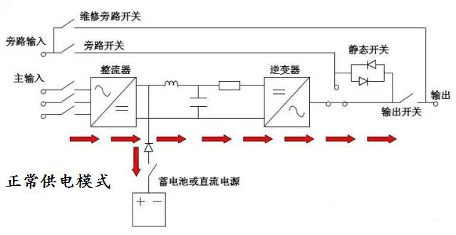 當市電輸入正常時,UPS 將市電穩壓后供應給負載使用,此時的UPS就是一臺交流式電穩壓器,同時它還向機內電池充電;當市電中斷(事故停電)時, UPS 立即將電池的直流電能,通過逆變器切換轉換的方法向負載繼續供應220V交流電,使負載維持正常工作并保護負載軟、硬件不受損壞。從而達到不間斷供電的目的。